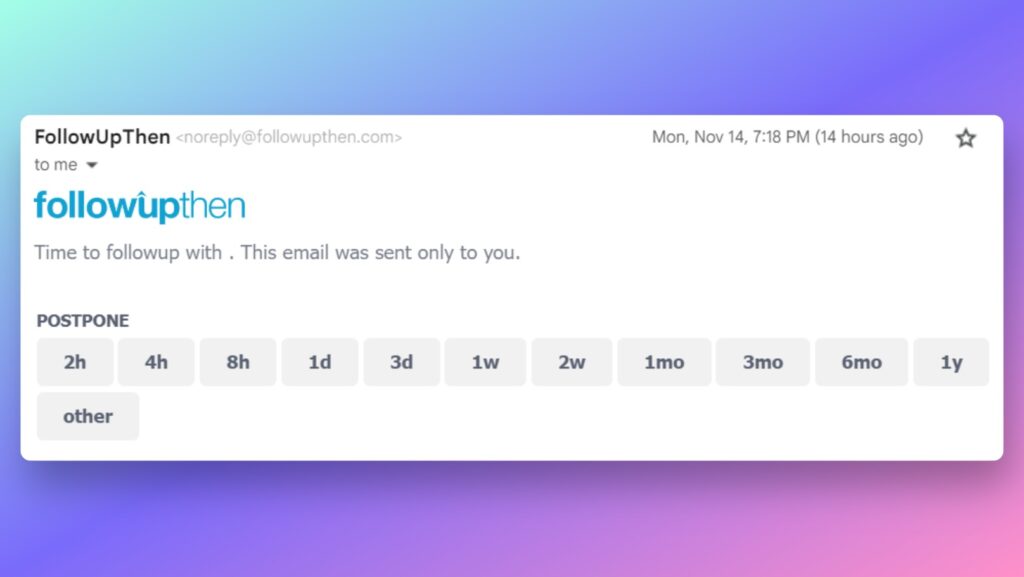 Normally I use Gmail’s snooze function for this purpose, but FollowUpThen has the advantage of working with any email provider. It’s also more efficient, since you can create a reminder from the BCC field at the same time that you’re writing the email. The tool is free to use for up to 50 active reminders at a time.