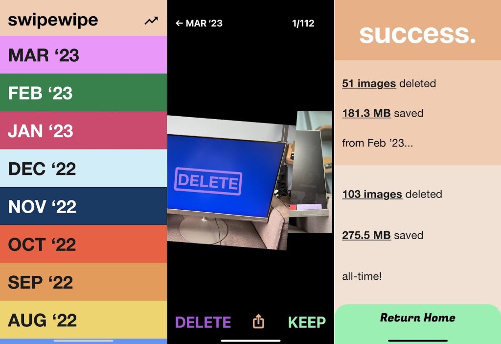 While Swipewipe isn’t the first app to try the “Tinder for photos” concept, I appreciate its uncluttered design and the way it breaks your camera roll into months, with a separate progress bar for each. That makes the job feel less daunting. Also: By dragging the current photo downward, you can see the previous photo behind it, which is helpful for quickly comparing two similar shots.
