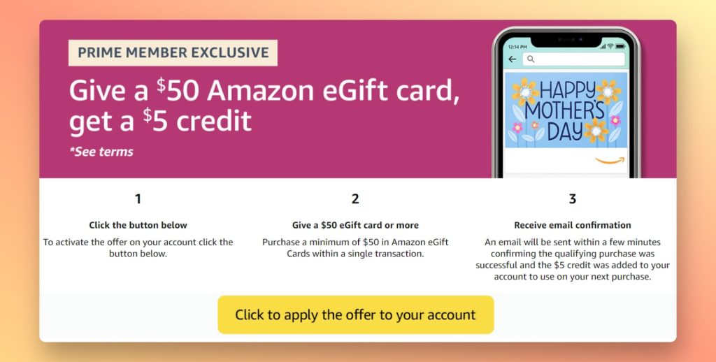 Amazon Prime members can currently get a $5 credit by purchasing a $50 Amazon gift card. Just visit the offer page, click the yellow “apply the offer” button, and purchase your card, which you can then send to someone else or use for yourself.