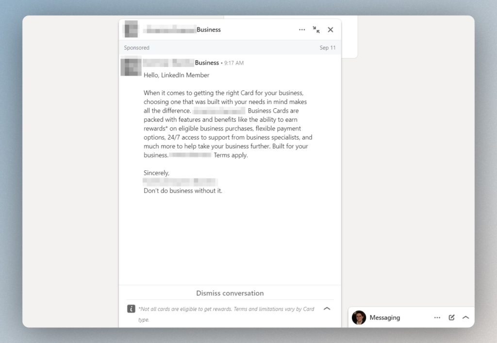 Banish LinkedIn’s message ads: Yesterday morning, I logged into LinkedIn (don’t ask) and was greeted with a direct message from a credit card company. Apparently this is a new “feature” called Sponsored Messaging, which lets businesses bother you with unsolicited chats unless you opt out. Here’s how to do that: