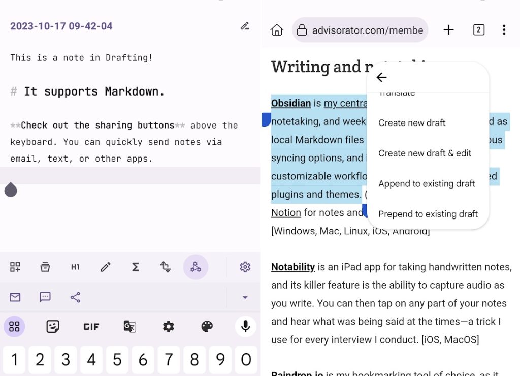 Drafting also has some helpful ways to bring text into the app: Just highlight some text on a webpage or use the Share button in your browser, for instance, and you can quickly add links and text to a new or existing note. The app pairs especially well with my Obsidian notetaking setup, with each note saving to a “Quick Notes” folder in my Obsidian vault for further editing. I’ve also added Drafting to my phone’s quick settings panel (per this week’s column) so I can start taking notes with just a swipe and a tap.