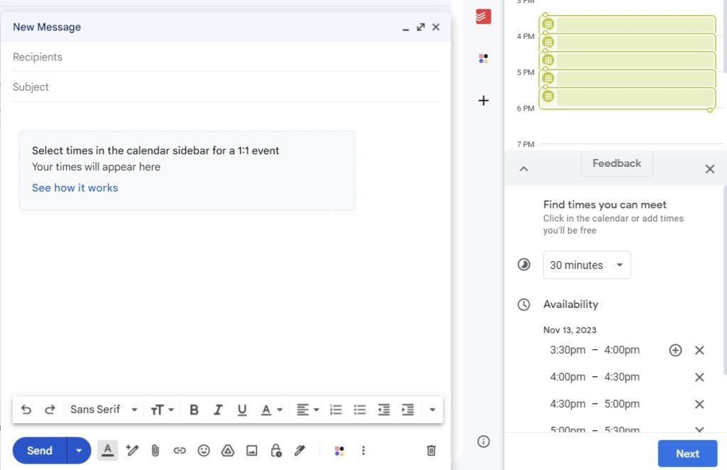 To find it, click the ⋮ button at the bottom-left of Gmail’s compose window, then select Set up a time to meet > Offer times you’re free. Your calendar will appear in a sidebar, and you can click the times when you’re available. The recipient will then be able to click on a time to book the meeting. Note that this only works for 1:1 meetings, but you can always add more people to the event once the date and time is set.