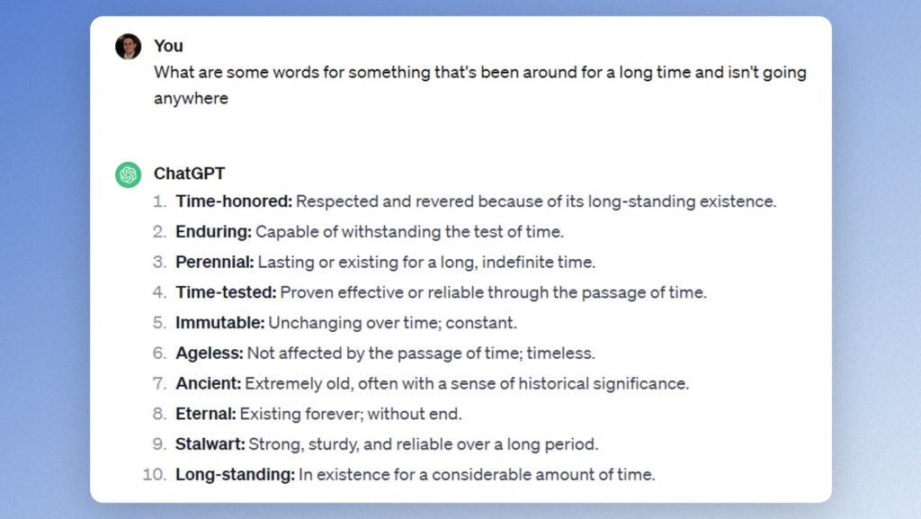 So here’s one: If you’re struggling to recall a specific word, try describing it to AI. Just write “What’s the word for,” followed by a description, and you should get a list of potential matches.