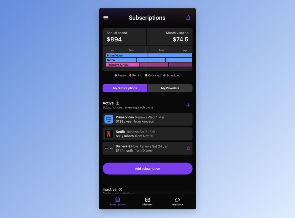 StreamWolf provides an overview of all your streaming subscriptions, shows you the total cost, and lets you cancel (or reactivate) individual services with just a button tap. It also offers some watchlist features so you can plan what to pay for at any given time.