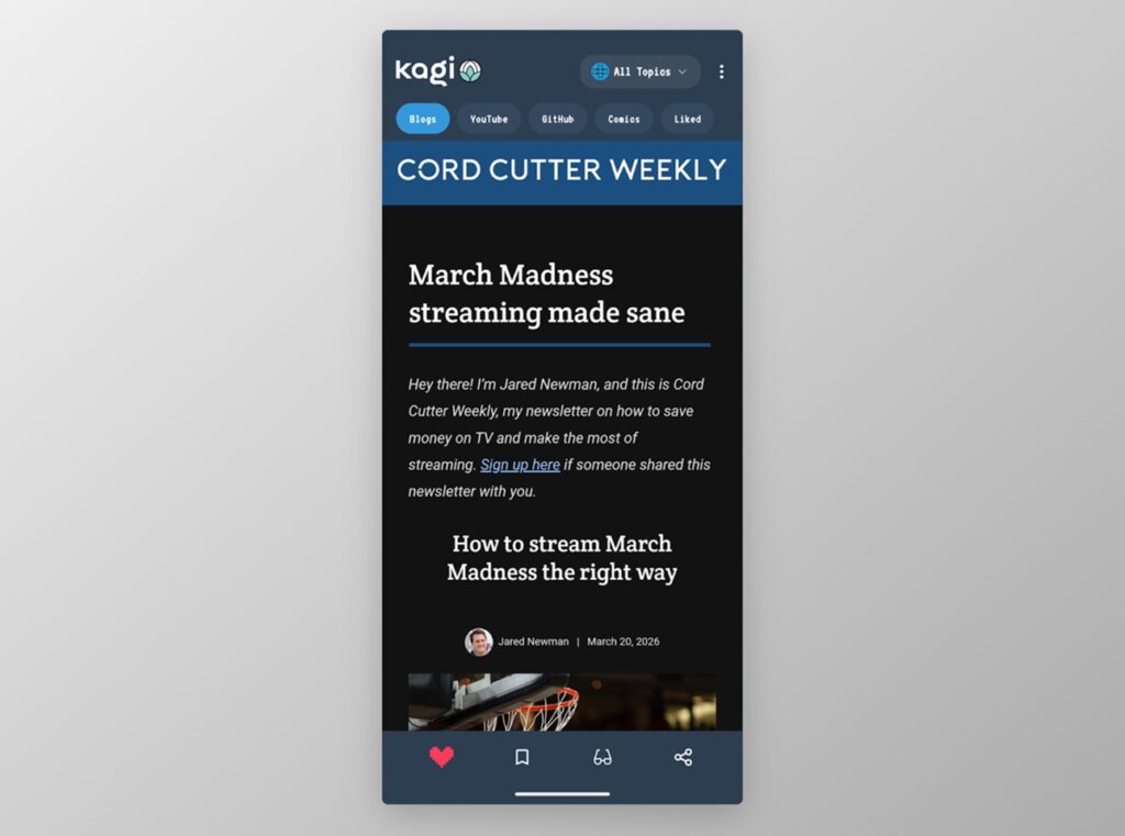 Read some blogs: Kagi’s Small Web app (for iOS, Android, and the web) is a fun way to discover independent websites and blogs. It reminds me of browsing the internet before huge sites like YouTube, Instagram, and TikTok came to dominate self-expression online. Just swipe right to flip between sites, and use the “Topics” header at the top to narrow things down.