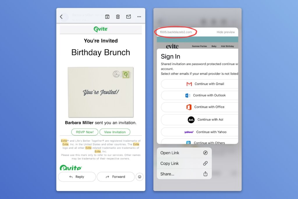 - Instead of linking to Evite.com, the invite led to a web address that I did not recognize.