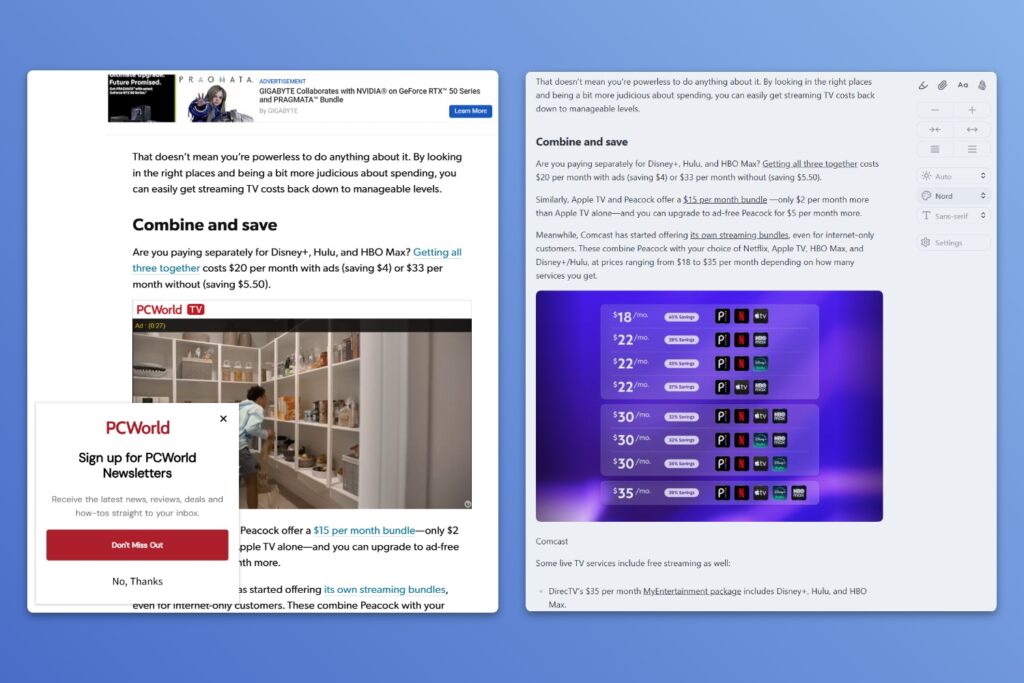 Easier online reading: Obsidian Web Clipper is a free browser extension that’s mainly used to save offline copies of web pages, but it recently added a “Reader” mode that conveniently unclutters online articles. While using the extension, click the book icon at the top to open your current web page page in a reader-friendly view, with no ads, unwanted videos, or pop-ups: