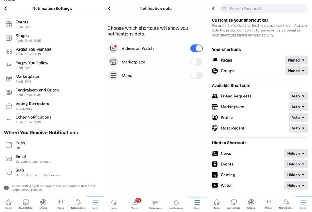 Customize the menu bar: Alternatively, you can hide videos and other unwanted tabs by heading to Facebook Settings > Shortcuts > Shortcut bar in the mobile app. Select "Pin" for the sections you care about and "Hide" for the ones you don't. |