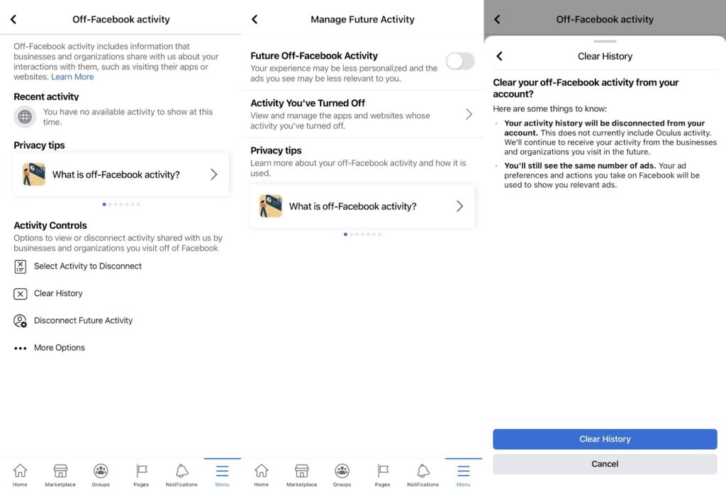 To stop it, head to the "Off-Facebook Activity" page (in the mobile app, you'll find this under Facebook Settings > Off-Facebook activity), then, follow these two steps: |