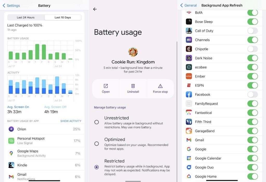 - On the iPhone, head to Settings > Battery, then select "Last 10 Days" near the top. Tap on the app list so that it says "Battery Usage By App," then look for potential culprits, such excess background activity or notifications from apps you barely use. If you'd rather not uninstall the app, you can head to Settings > General > Background App Refresh to limit its background behavior.