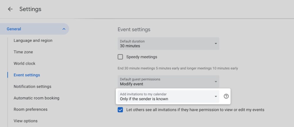 Just open the Google Calendar settings page and head to "Event settings," then click "add invitations to my calendar" and select "Only if the sender is known." With this setting, invites will only appear on the calendar when they come from someone you've interacted with or added to your contacts. (Google Workspace users will also see invites from anyone with the same company domain name.) |