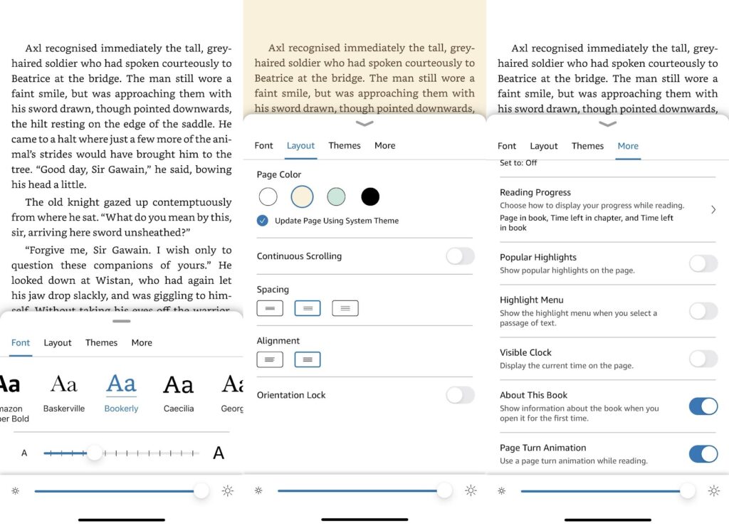 Personally, I always visit the "More" tab and enable "Page turn animation," which lets me compulsively dogear the virtual pages while reading. I also disable "Popular Highlights," because nothing ruins a great quote like seeing it underscored for emphasis. (Too bad Amazon doesn't sync these settings across devices.) |