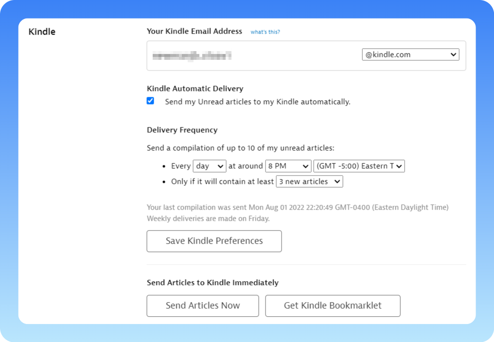 - Back in Instapaper settings, enter your Kindle email address, then enable "Kindle Automatic Delivery." Set a delivery frequency, and hit "Save Kindle Preferences."